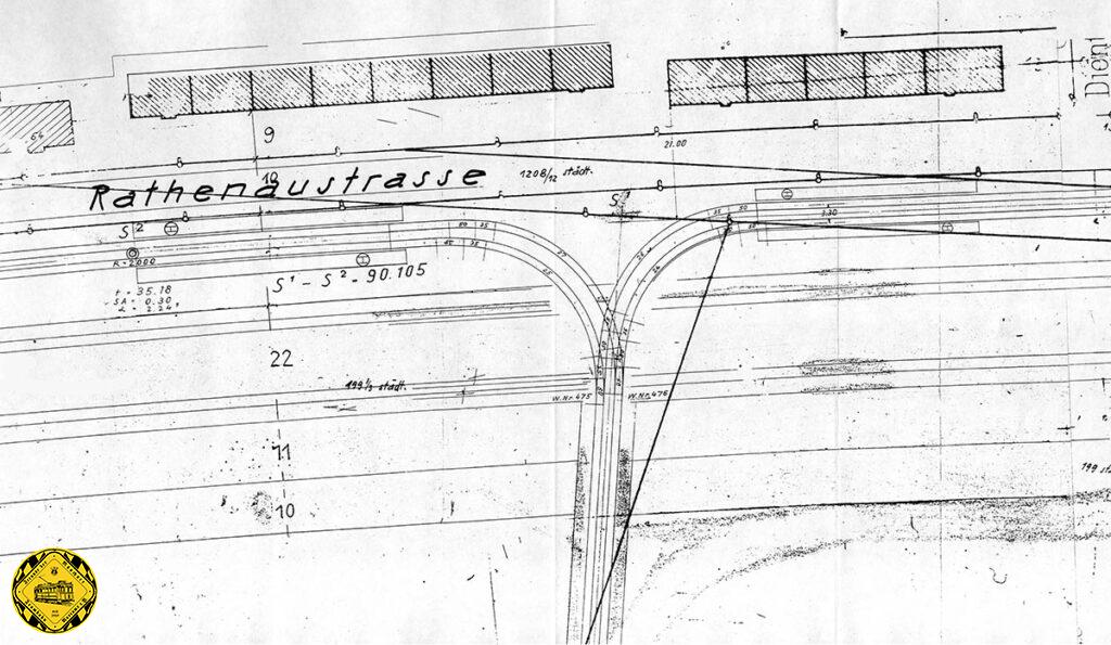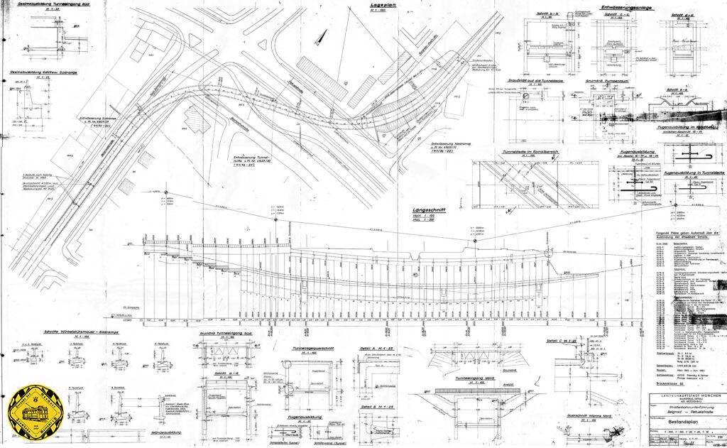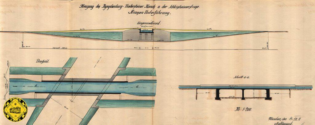 Nur ein paar 100 Meter weiter westlich plante man bei der Verlängerung der Linie 8 über den Nymphenburger Kanal nach Milbertshofen durch die Riesenfeldstraße neben einer Brücke für die Überquerung der wilden Wasser auch eine gewagte Brücke für den Bach mit einer Straßen- & Trambahnunterführung. Diese Planung vom 14. August 1911 war damals den Verantwortlichen wohl zu gewagt und so verschwand sie wieder in der Schublade des Planer, bis wir sie jetzt wieder ausgegraben haben.