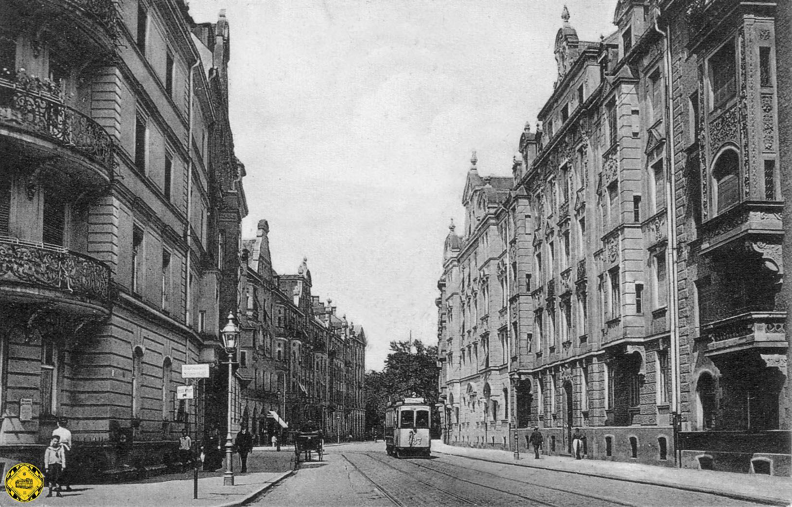 Wagen der Linie 2 in der Wagmüllerstraße kurz vor der Linkskurve in die heutige Unsöldstraße, die damalige Verlängerung der Galeriestraße. Diese Strecke wurde ab 1897 befahren.