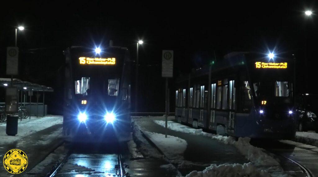 Die letzten 15er stehen an der Schleife Großhessloher Brücke bereit zur Fahrt stadteinwärts, dann ist diese Linie (vorläufig) Geschichte.