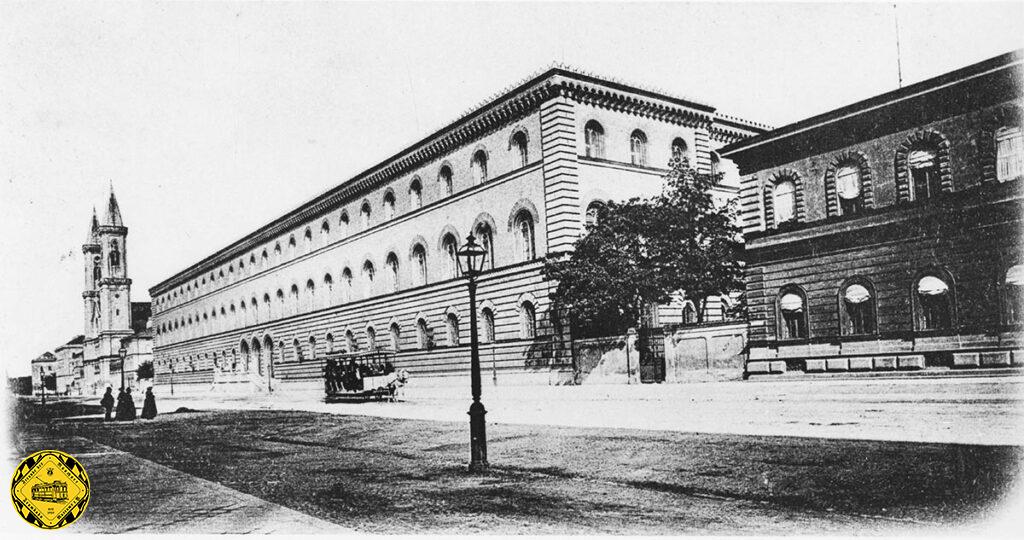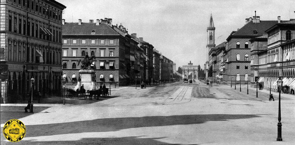 Am 06.09.1877 wird die Strecke Lenbachplatz über den Maximiliansplatz und durch die Briennerstraße zum Odeonsplatz und weiter über die Galeriestraße und Siegestor zur Hohenzollernstraße als Pferdebahnlinie in Doppelspur eröffnet, die Schwabinger Linie.