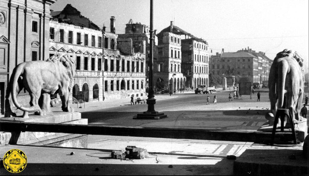1945 schauen die Löwen auf einen schwer zerstörten Odeonsplatz.