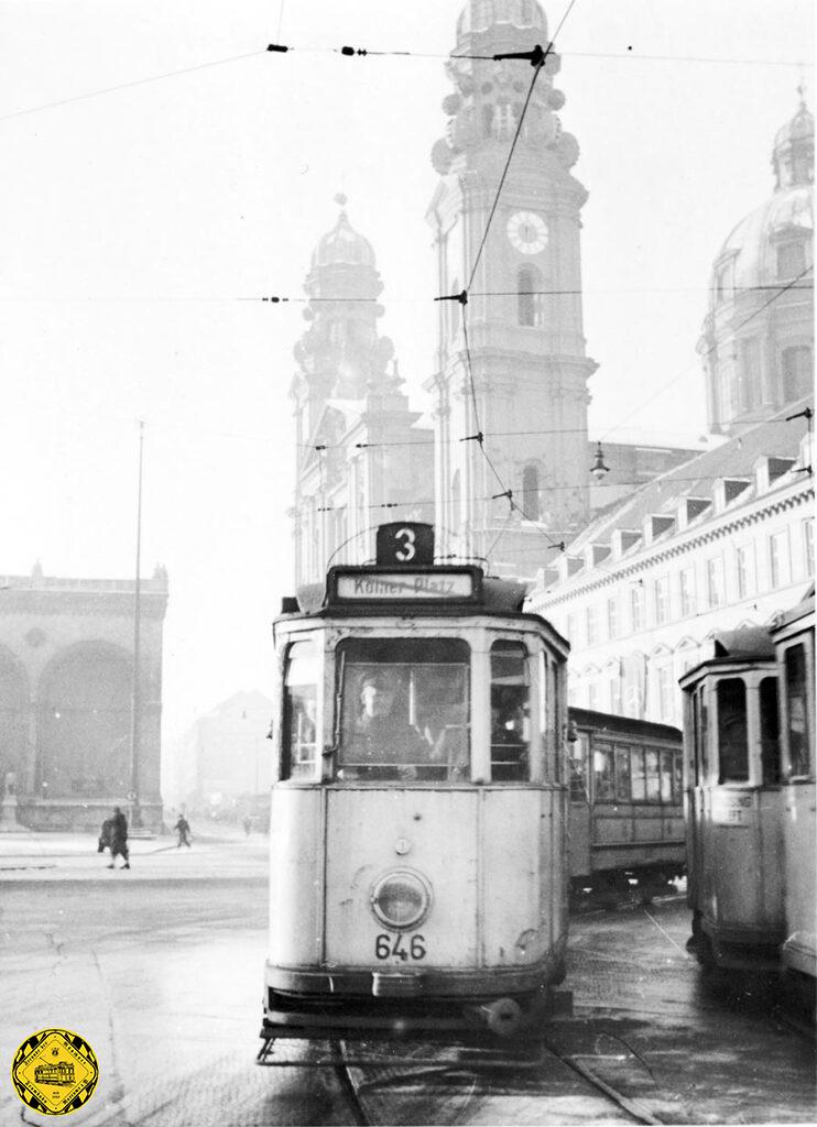 Der F-Tw 646 am Odeonsplatz auf der Linie 3 auswärts 9.1.1952