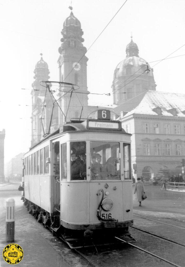 Linie 6 mit dem D1-Tw 516 am Odeonsplatz auswärts am 09.01.1952