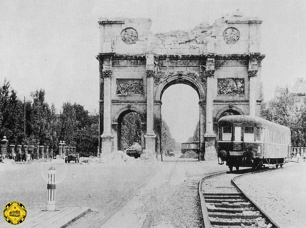 A2-Tw 161 fährt auf der Linie 10 vom Odeonsplatz kommend durch das Siegestor auswärts im Jahr 1908.