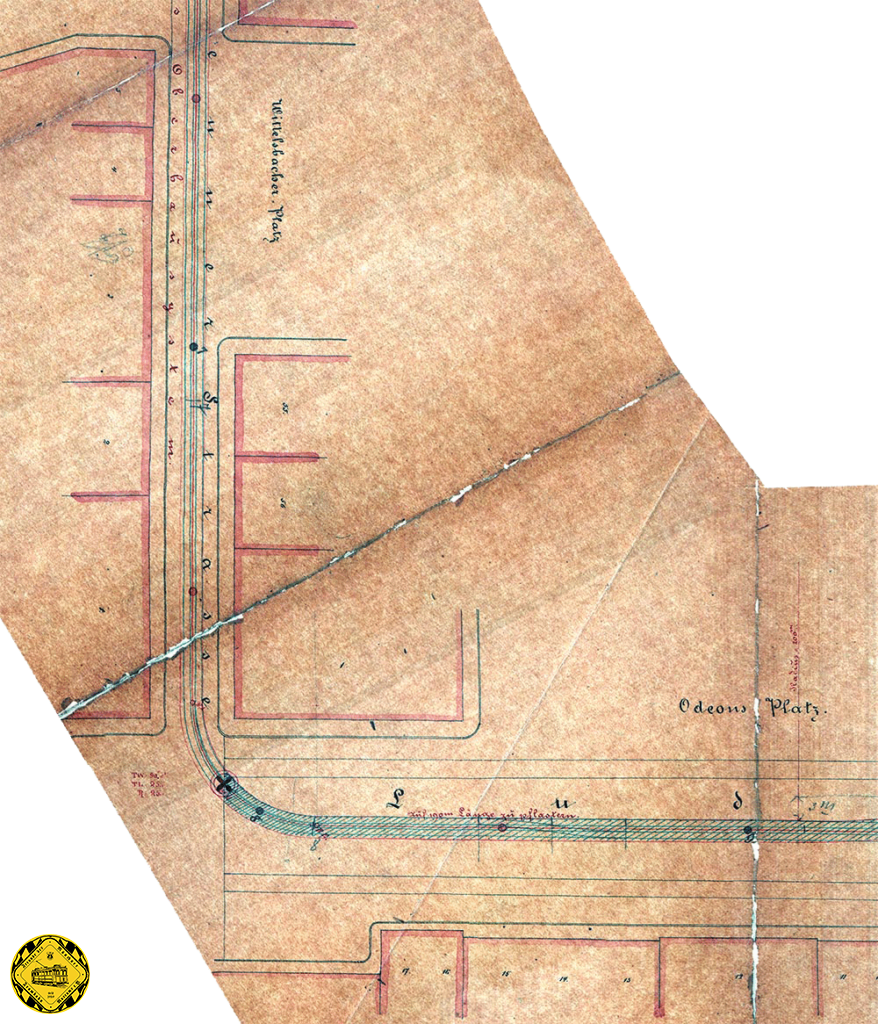 Und weil wir alles genau zeigen wollen: das ist der Ausschnitt Odeonsplatz vom Gleisplan vom 19.März 1877 für den Bau der Pferdetrambahn im Original, einer der ältesten vorliegenden Pläne in unserer Archivsammlung von Streckenplänen.