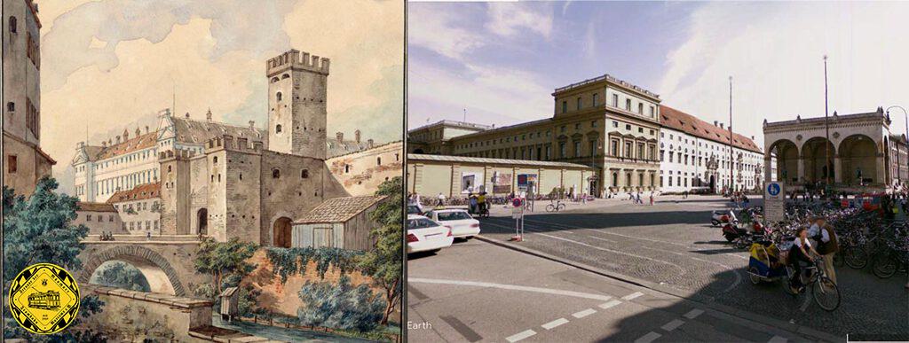 Zwischen diesen Bildern liegen etwas über 200 Jahre: der Odeonsplatz 1812 mit dem Schwabinger Tor und dem Stadtgraben und heute im Jahr 2011, ohne Schwabinger Tor mit zurückgesetzter Feldherrenhalle, – nur die Residenz im Hintergrund ist geblieben, nach dem Krieg etwas schlichter wiederaufgebaut. 1817 wurde das Schwabinger Tor für die Anlage der Achse Odeonsplatz–Ludwigstraße abgerissen.