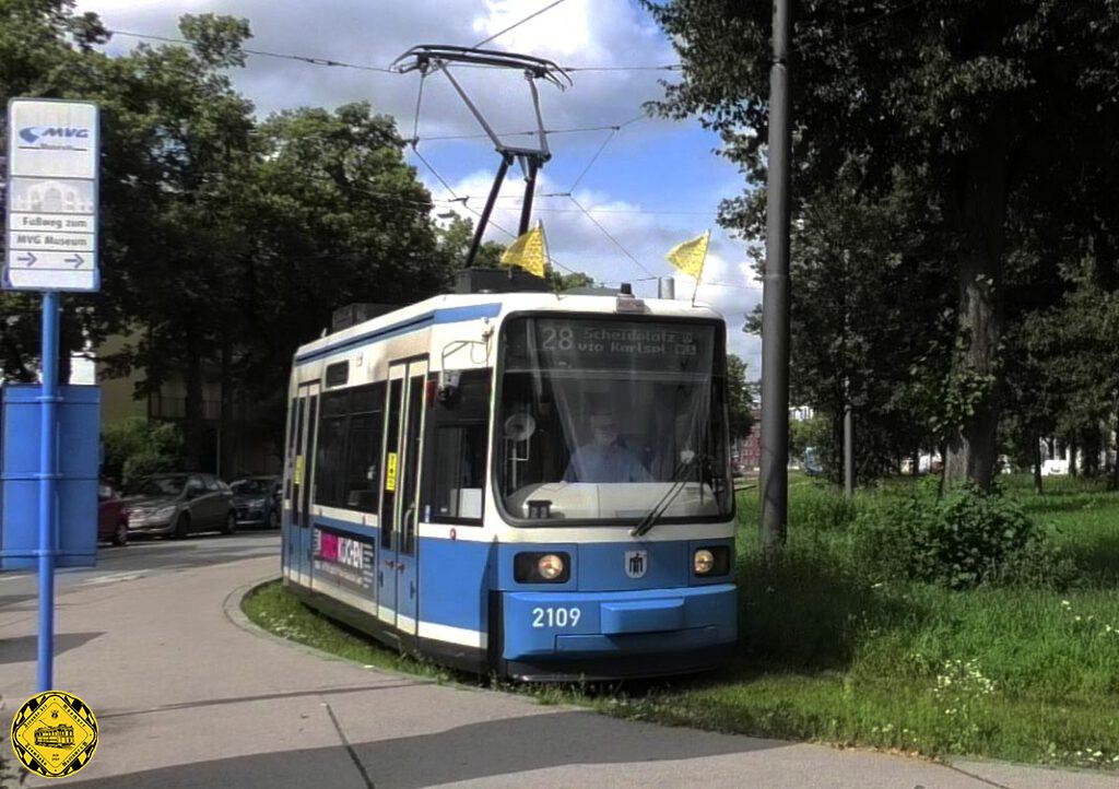 Die erste Trambahnanbindung des Giesinger Bahnhofs erfolgte am 1.2.1909 auf der 975m langen Strecke vom St.-Martins-Platz – Eintrachtstraße – Schlierseestraße zum Giesinger Bahnhofplatz nach einer Bauzeit vom 11.1.1909 bis 28.1.1909. Vorläufig gibt es am Giesinger Bahnhof nur ein Stumpfgleis mit Weiche zum Gleiswechsel. Daher konnte die Strecke auch anfangs nur mit Zweirichtungs-Fahrzeugen ohne Beiwagen befahren werden.