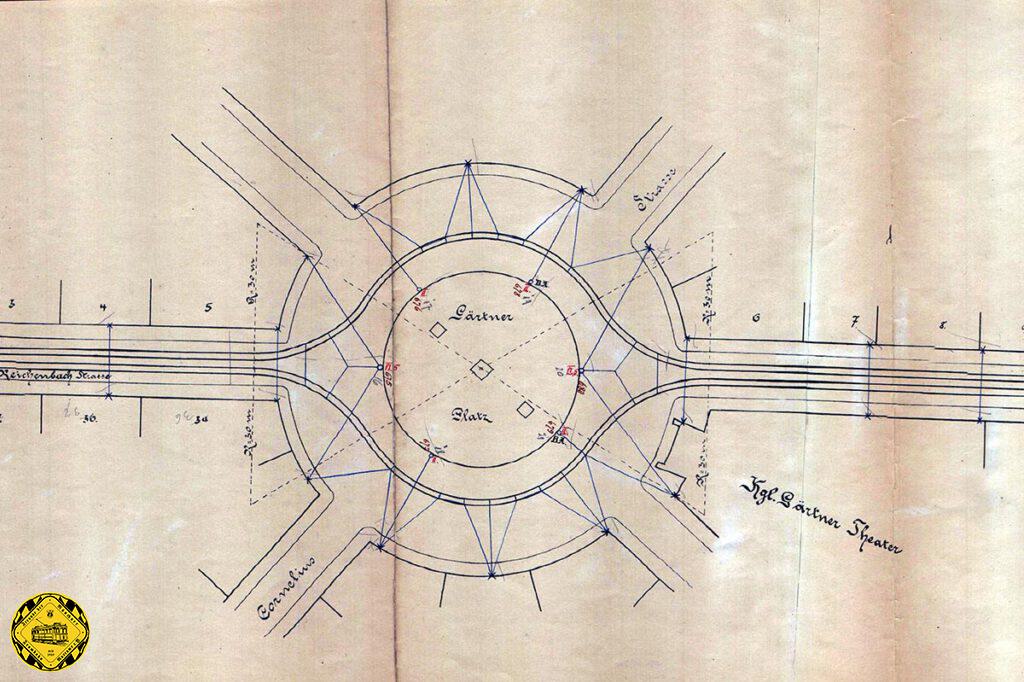 Unser Gleisplan zeigt die Planung der Oberleitung 1897 für den Gärtnerplatz.