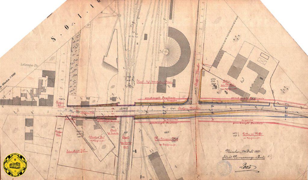 Schließlich wird 1894 das Projekt tatsächlich umgesetzt und nun hat die Rosenheimerstraße ihre Unterführung. Dazu wurden allerdings einige Baulinienänderungen nötig und Grundstücks-Abtretungen.