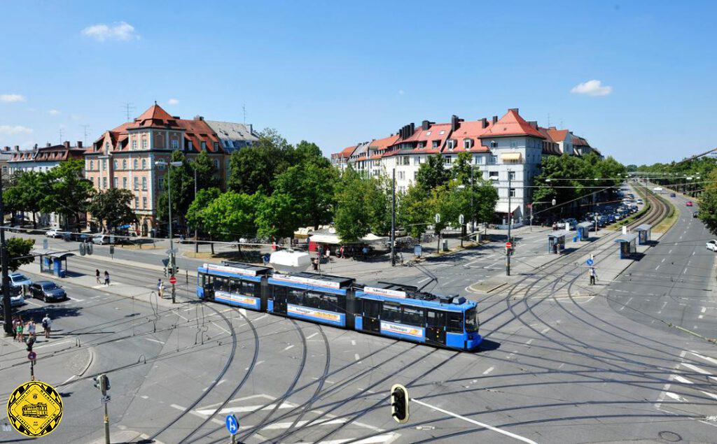Baubeginn für eine neue Verbindung von hier zum Rotkreuzplatz ist der 17. Oktober 1927. Ein knappes Jahr später geht am 15.8.1928 die Neubaustrecke Strecke durch die Leonrodstraße zwischen Rotkreuzplatz und Landshuter Allee in Betrieb mit der Linie 22.