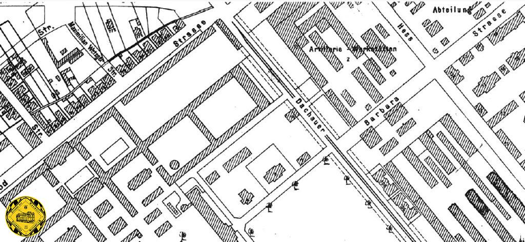 Auf unserem Bild sieht man die Lazarett-Not-Anschlußgleise im Vordergrund in der heutigen Schwere-Reiter-Straße zum Reserve-Lazarett Oberwiesenfeld.