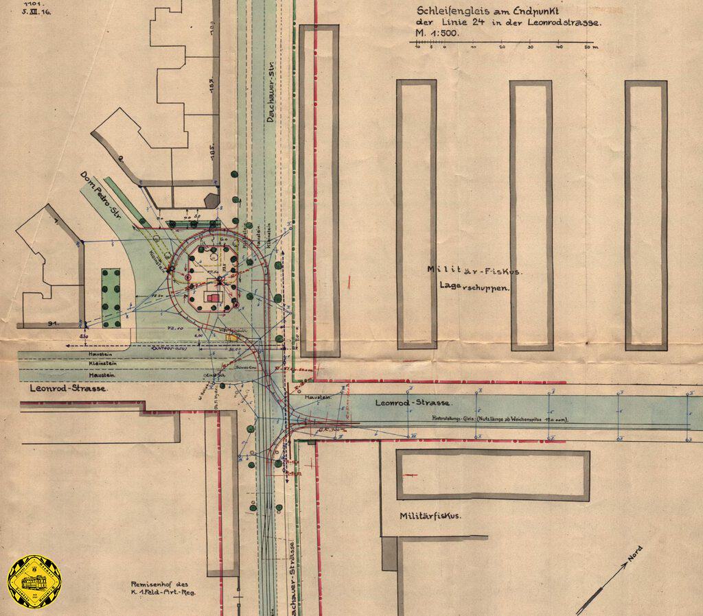Um auch die nun vermehrt eingesetzten Beiwagen-Züge auf der Linie 24 zügig wenden zu können, wurde 3.8.1917 die erste Schleife am Leonrodplatz für die Linie 24 in Betrieb genommen. Wie sooft in den Münchner Gleisplänen sehen wir auch hier ein Hinterstellgleis in die heutige Schwere-Reiter-Straße, damals noch Leonrodstraße. Das war die Zufahrt zum Hilfslazarett auf dem Oberwiesenfeld. Das 120m lange Hinterstellgleis in der leonrodstraße blieb noch einige zeit bestehen, bevor ein kürzeres Hinterstellgleis 1927 in die Don-Pedro-Straße gelegt wurde.