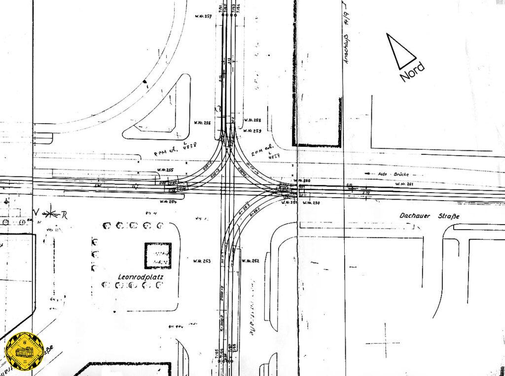 Neuerungen ab dem 27.7.1991 am Knoten Leonrodplatz. Wegen dem Abbau Stahlhochbrücke an der Dachauer Straße werden die Weichen 252, 254, 256, 257, 260 und 261 in Geradeausstellung verschweißt, abbiegen ist nicht mehr möglich. Im August 1993 bekommt dann der Leonrodplatz seinen Gleisplan, den er auch heute noch hat.