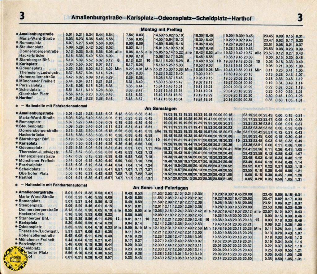 • 29.03.1964     (Harthof -) Scheidplatz – Kölner Platz – Leopoldstraße – Münchner Freiheit – Leopoldstraße – Ludwigstraße – Odeonsplatz – Lenbachplatz – Karlsplatz – Prielmayerstraße – Hauptbahnhof – Arnulfstraße – Steubenplatz – Romanplatz – Amalienburgstraße