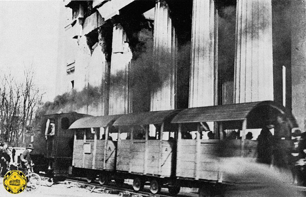 - es wurden dampfbetriebene Kleinbahnen als Ersatz für zerstörte Trambahnwagen oder zur Überbrückung zerstörter Infrastruktur eingesetzt. Diese Hilfszüge fuhren auch abwechselnd mit Schuttzügen auf den Strecken. Die Wagen waren damals entweder ganz offen oder notdürftig durch Hilfsdächer abgedeckt und hatten Holzbänke meiste längs zur Fahrtrichtung.