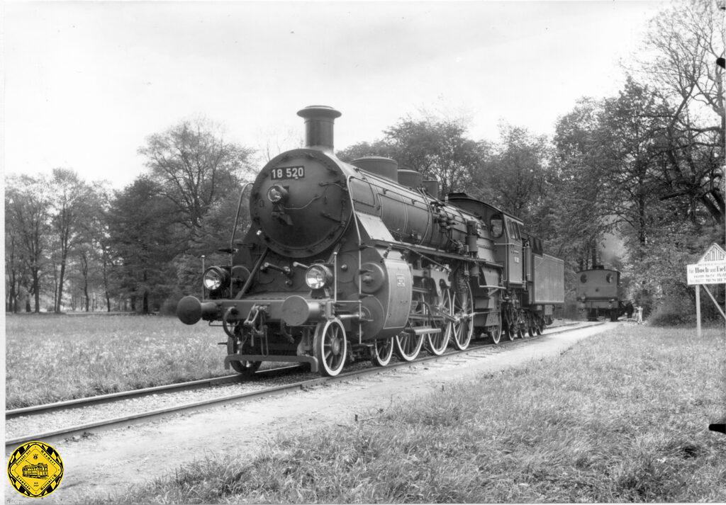 Auslieferung von Loks durch den Englischen Garten: die J.A.Maffei als Zuglok mit der S 3/5 3317 und einer Schmalspurlok Steinbeis Mallet FNr. 2438 unterwegs nach Moosach. Bei Dipl. Ing Hoffmann steht 1927 nachzulesen: „Es sei angeführt,daß Züge auf dem Maffei’schen Industriegleis, welches den äußeren, also schwach besuchten Englischen Garten durchschneidet, nur im Schritt fahren dürfen und gleichwohl von ununterbrochenen Glockenzeichen begleitet werden müssen.“