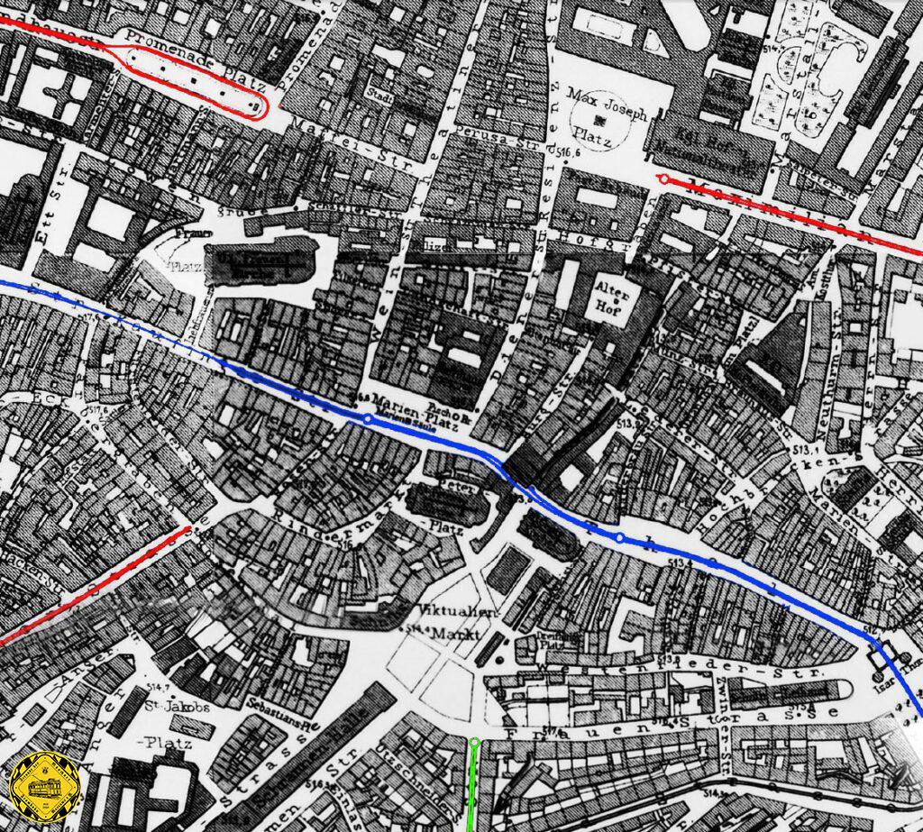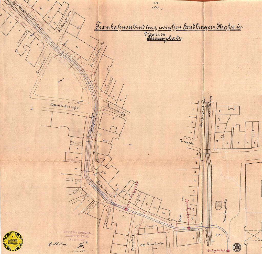 Die Planungen zur Rosenstraße verschwanden sehr schnell wieder, weil diese zur Sendlingerstraße hin sehr schmal war. Die Variation durch die Dienerstraße wurde auch bald verworfen, weil diese Strecke an der Front der Residenz vorbeiführen würde. Es gab zwar keinen dokumentierten Einspruch von Königsseite, aber der vorhereilende Gehorsam der Untertanen in den Planungsbüros war hier tätig. Beide Pläne sind aus dem Jahr 1892, also noch ein Jahr vor der Planung einer Schleife über Rindermarkt-Rosenstraße, die wir weiter oben dokumentierten.