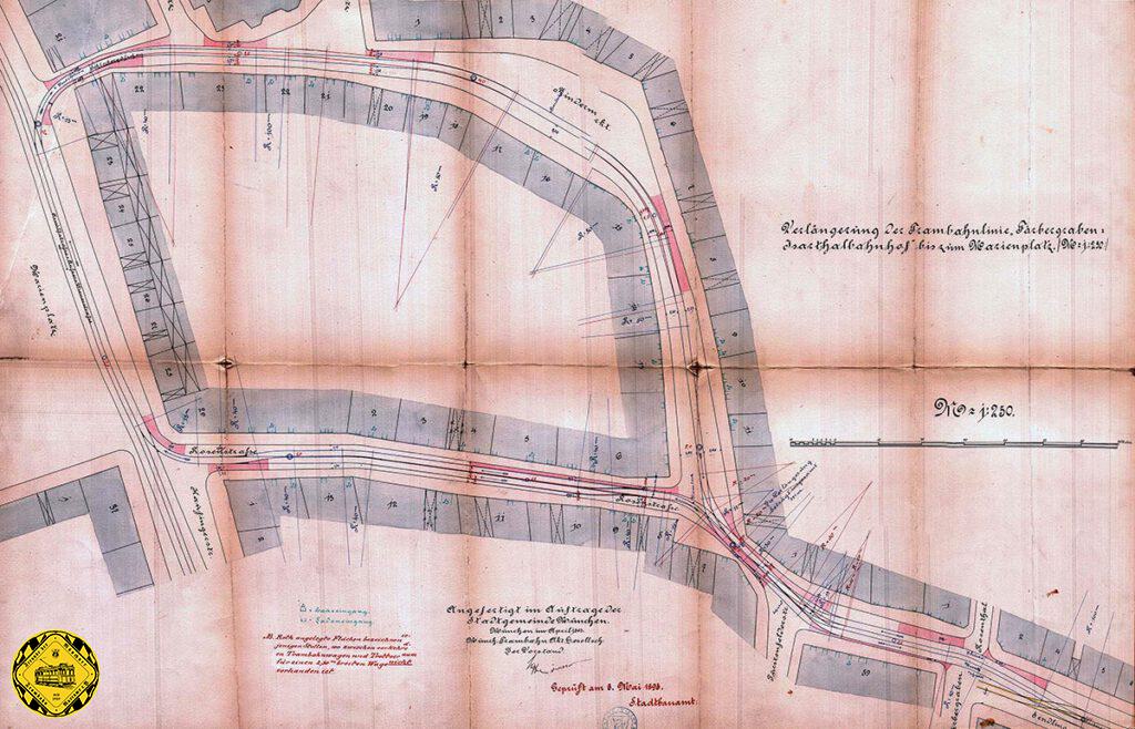 Dieser visionäre Plan vom 8.Mai 1893 schlägt eine Wendeschleife für die Isartal-Linie als Häuserschleife über Rindermarkt, Marienplatz und Rosenstraße vor. Dieser Plan hatte zwei gravierende Haken: das schmale Schleckergässchen zwischen Altem Peter und Marienplatz und die enge Rosenstraße bis vor das Ruffinihaus. So blieb auch dieser Plan nicht umgesetzt in der Schublade, bis wir ihn wieder im Stadtarchiv ausgegraben haben. Und der folgende Briefwechsel zeigt, warum diese Streckenführung damals nicht zustande kam….