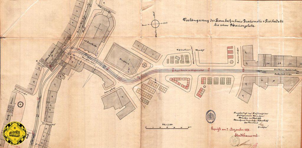 Man kann dem Magistrat, der Trambahngesellschaft und dem Bauamt Ende des 19.Jahrhunderts nicht unterstellen, in Hinsicht auf Planungsvarianten bei der Nord-Süd-Durchquerung der Stadt mit einer Pferdebahn untätig gewesen zu sein. Die Straßen zu dieser Zeit waren deutlich enger als die heutigen Baulinien und es wurde z.B. Brennholz vor den Häusern gelagert und es herrsche damals schon Lieferverkehr, vergleichbar mit dem der heutigen Postzustellfahrzeuge. So ging man alle möglichen Varianten durch, einspurig und zweispurig, im Einbahnverkehr und Gegenverkehr. In den Archiven liegen noch einige weitere Variationen, aber die hier gezeigten sind die beiden grundsätzlichsten in den zu nutzenden Möglichkeiten: alles in einer Straße oder in Fahrtrichtungen geteilt.