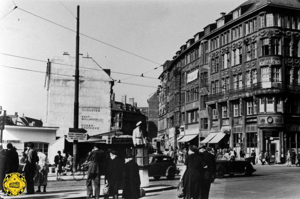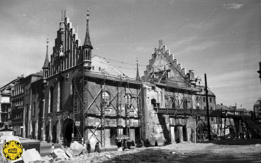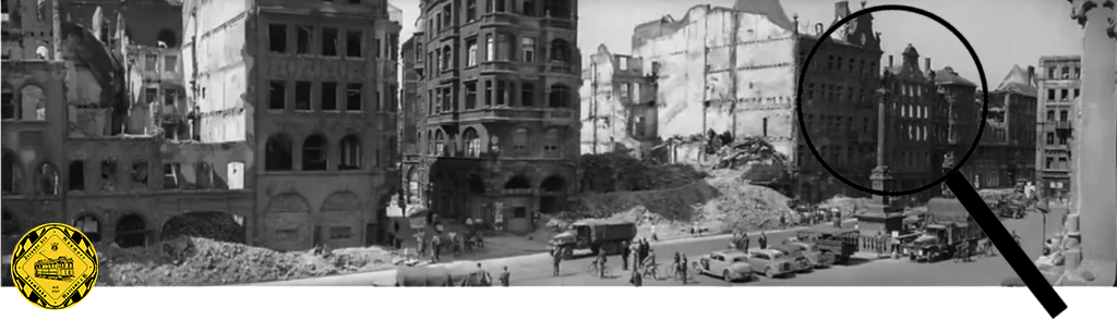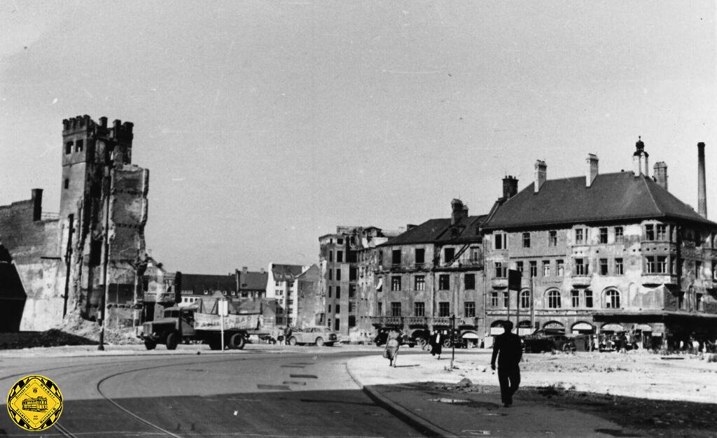 Nach Kriegsende wurde die Ruine des alten Rathauses notdürftig gesichert, um am 16.02.1947 wieder den Trambahnverkehr aufnehmen zu können.