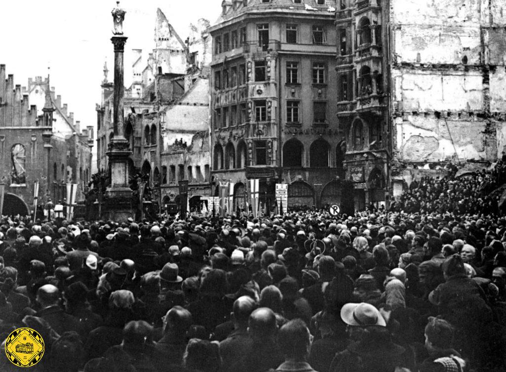 Zwei Panorama-Bilder vom Marienplatz im Jahr 1945 kurz nach dem Ende des 2. Weltkriegs: nur wenige Häuser stehen noch und viele sind Ruinen und müssen abgerissen werden.