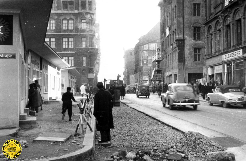 In der Weinstraße beginnen 1952 die Bauarbeiten zum Entfernen der Gleise.