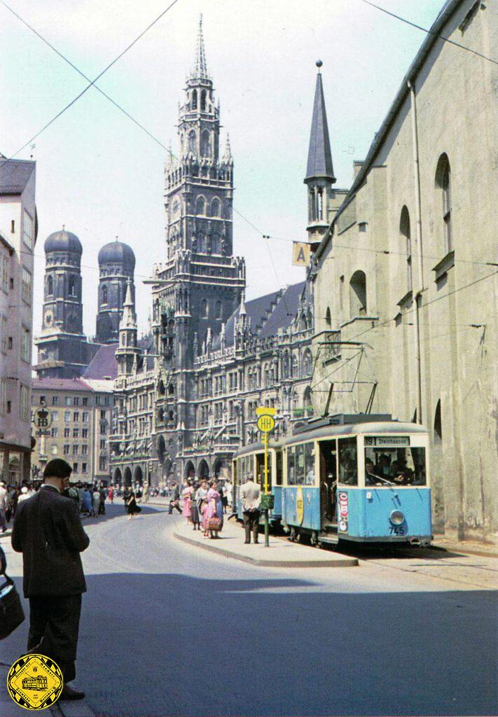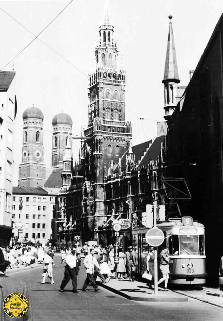 Das klassische Marienplatz-Postkartenbild mit Trambahn: Linie 9 mit M4-Tw 933 + Bw an der Haltestelle Marienplatz auswärts im Juli 1961