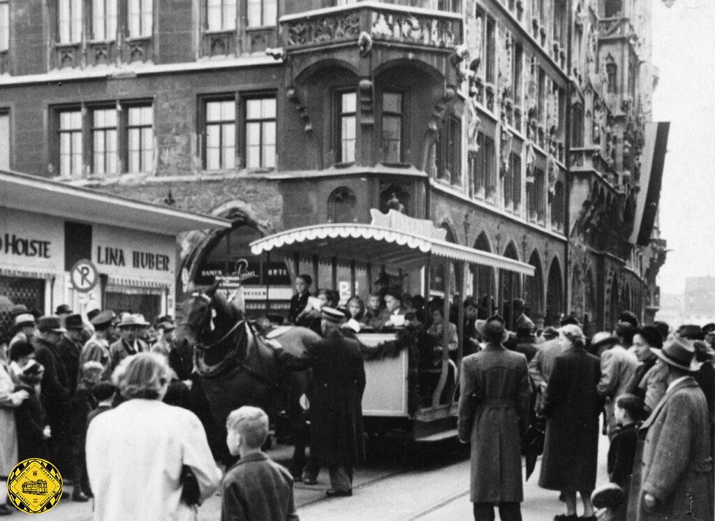 1951 bzw. 1952 wurden auf der Strecke Strecke Weinstraße ab Maffeistraße zum Marienplatz die Gleise rückgebaut. Kurz zuvor wurden die Gleise für die erste Fahrt der historisch wieder aufgebauten Pferdetrambahn genutzt: am 21.Oktober 1951 pendelt Pferdebahnzug in Weinstraße anlässlich 75 Jahre Münchner Trambahn. Das war dann die wirklich allerletzte Trambahn in der Weinstraße.