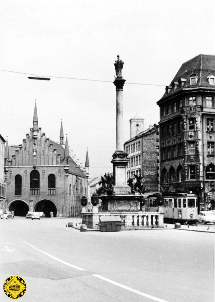 Trambahnmäßig ändert sich am Marienplatz nach dem Krieg nicht mehr viel: zwei gerade Gleise Ost/West über den Platz und der Autoverkehr nimmt enorm zu. 1961 beginnen mit einen ersten Fahrkartenautomaten die modernen Zeiten auch bei der Münchner Trambahn.