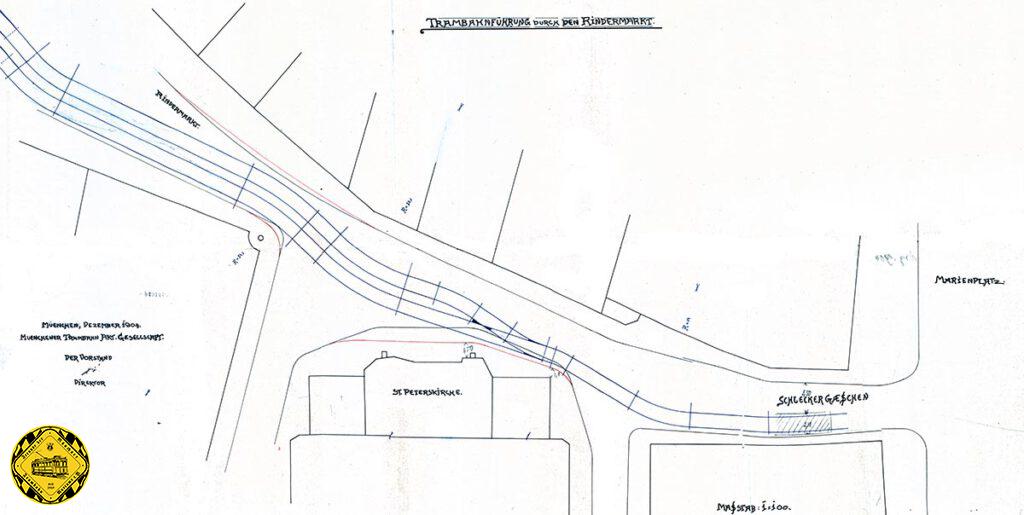 Der Zeitgeist setzt neue Akzente und so war Ende des 19.Jahrhunderts das Schleckergässchen völlig unabhängig vom Namen einer verflossenen Drogeriekette auf die Ansammlung von Feinkostgeschäften zurückzuführen. Zwar wurden Mitte des 19.Jahrhunderts die Straßennamen weitgehend von z.B. „Kaufingergasse“ in „Kaufingerstraße“ umbenannt, um etwas Großstadtflair zu verbreiten, aber das Schleckergässchen war weiterhin ein Gässchen. Und jetzt kam die elektrische Trambahn, und wollte eine Strecke als Verlängerung der in der Sendlingerstraße am Färbergraben endenden Linie durch das enge Gässchen zum Marienplatz und weiter zum Odeonsplatz bauen, die Nord/Süd-Durchquerung des Stadt.