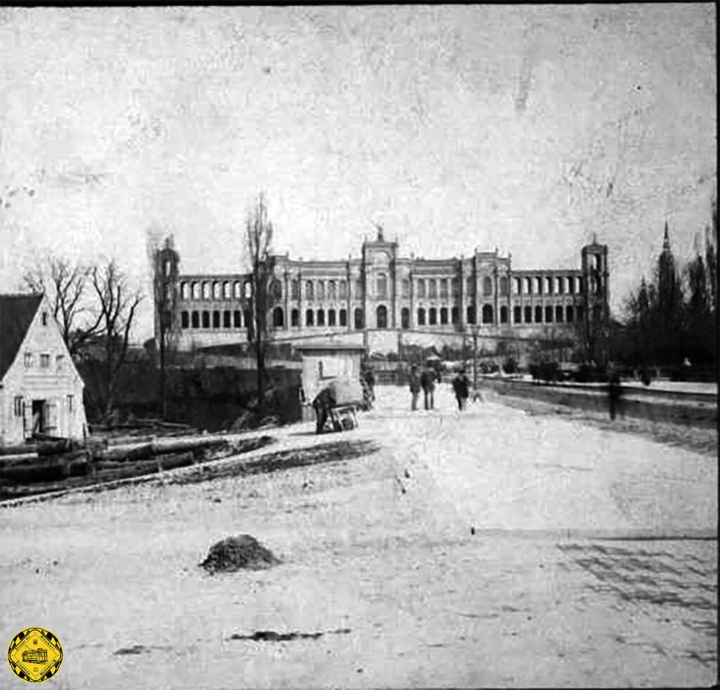 Die Baustelle auf dem Bild ist die des Maximilianeums, das als Elite-Schule und Internat betrieben wurde und erst nach dem 2.Weltkrieg, als das erste Landtagsgebäude an der Prannerstraße zerstört war, zum Sitz des Landtags umgewidmet wurde.