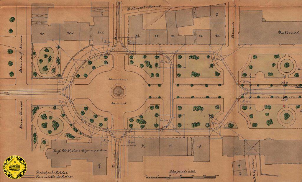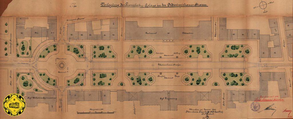 Beim unten stehen Plan darf man sich nicht irritieren lassen: diesmal ist erstens Norden mal wieder oben und außerdem benutzte man einen Katasterplan von 1888 als Grundlage, als es den Nordring noch nicht gab. Aber vermutlich dachte man sich, das es ja um die Schienenlage in der Maximilianstraße ging, das stört weiter nicht.