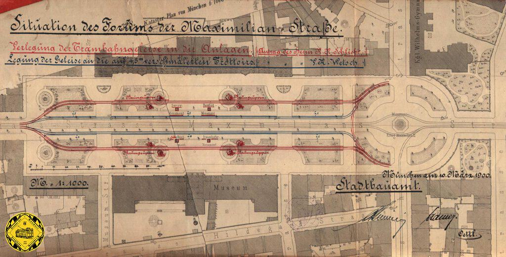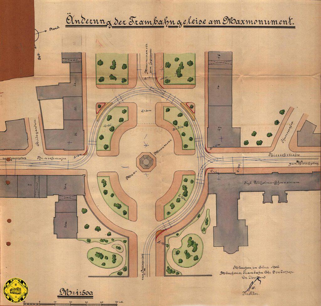 Leider ist dieser Katasterplan undatiert. Er zeigt eine Schleife am Maxmonument, die allerdings im Westen in Richtung Nationaltheater in eine mittige Gleisführung mündet. Diese mittige Gleisführung wurde 1899 mit der Elektrifizierung geändert. Somit gehen wir Trambahnhistoriker davon aus, dass diese Schleife wohl erst nach 1898 geschaffen wurde.