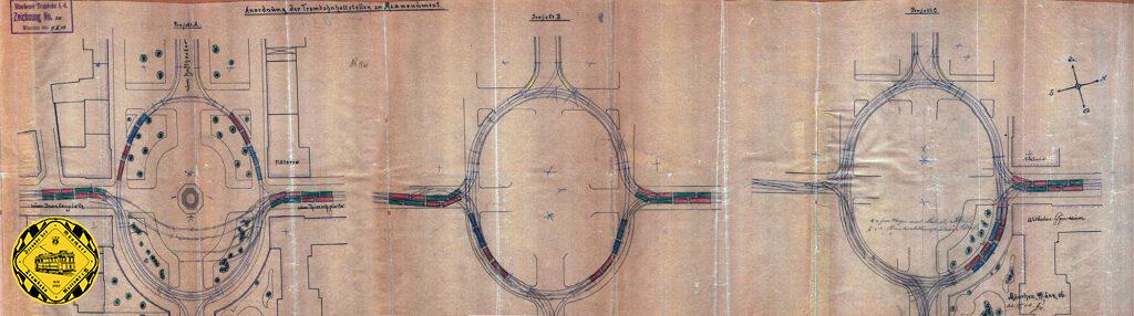 Schließlich einigte man sich auf die Schleifenform, die der heutigen Schleife nicht unähnlich ist. Allerdings gab es noch Ideen zur Führung der Gleise auf der Maximilianstraße, die hier noch geplante mittige Führung war noch nicht endgültig.