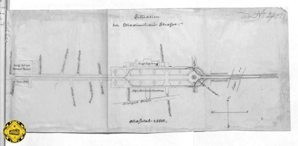 Bei Recherchearbeiten sind wir auf diese Planungs-Skizze gestoßen, die die geplante Pferdebahnlinie vom Hoftheater (heute Nationaltheater) durch die Maximilianstraße etwa 1880 zeigt. Die Führung beginnt eingleisg links am Hoftheater und spaltet sich dann vor den Regierungsgebäuden auf und kommt erst hinter dem Maxmonument wieder zusammen (mit noch kontroverser Trassenführung) um dann zweigleisig mit Schmalstellen über die Maximiliansbrücke zu führen. Als Sparmaßnahme hatten beide Brückenteile nur eine Breite von 13 m. Im Rahmen des Brückenbauprogramms wurde in den Jahren 1903–1905 nach Entwurf des Architekten Friedrich von Thiersch die Brücke über die innere Isar verbreitert, die über die äußere Isar neu gebaut.