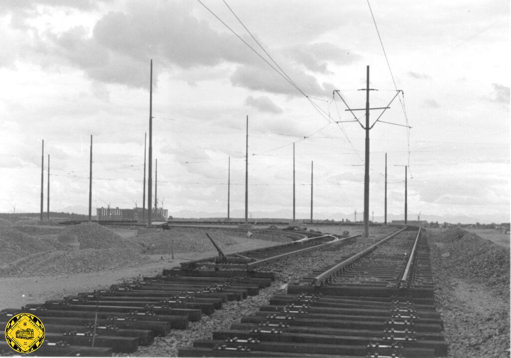 Die Baustelle der Gleisarbeiten der Strecke nach Neuperlach geht noch etwas ins Niemandsland: der so frühe Planung- und Umsetzungssvorgang für eine Verkehrsanbindung eines neuen Stadtviertels, das noch gar nicht gebaut ist, ist einmalig in München. Obwohl geplant ist, Neuperlach ab 1980 per U-Bahn zu erschließen, baut man noch eine Trambahnstrecke mit einem geplanten Verfallsdatum.