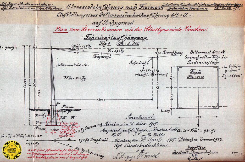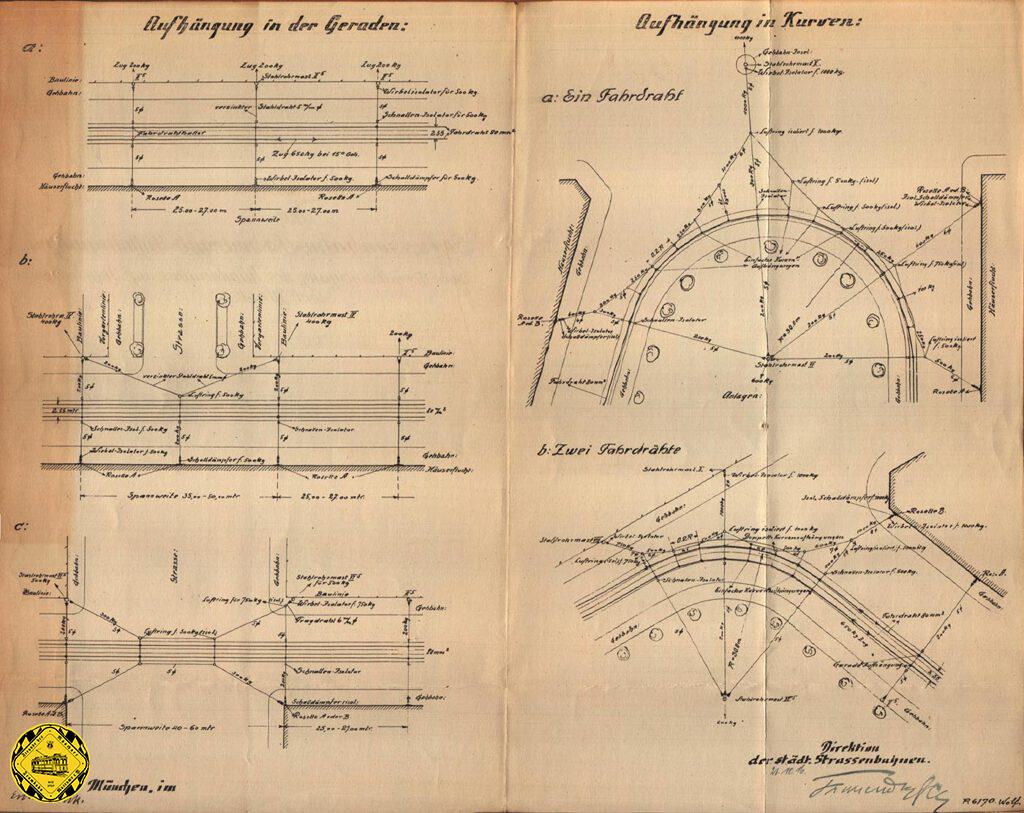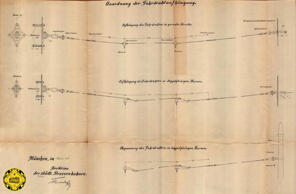 Verschieden Dokumente aus dem Jahr 1895 zeigen die Planungen sehr gut. Hier ist die Aufhängung der Oberleitung bei beidseitiger Bebauung in der Sendlingerstraße gezeichnet.