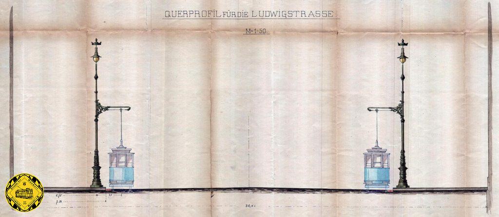Dieser Plan zeigt eine schematische Schnitt-Darstellung der Ludwigstraße von 1898 mit seitlicher Gleislage. Damit würde die Oberleitung nicht die gesamte Straße überspannen. In der Lindwurmstraße gab es ähnliche Planungen mit kombinierten Laternen-/Oberleitungsmasten, die von der Münchner Gießerei Kustermann geliefert wurden. Die Entwürfe hier sind ähnlich.
