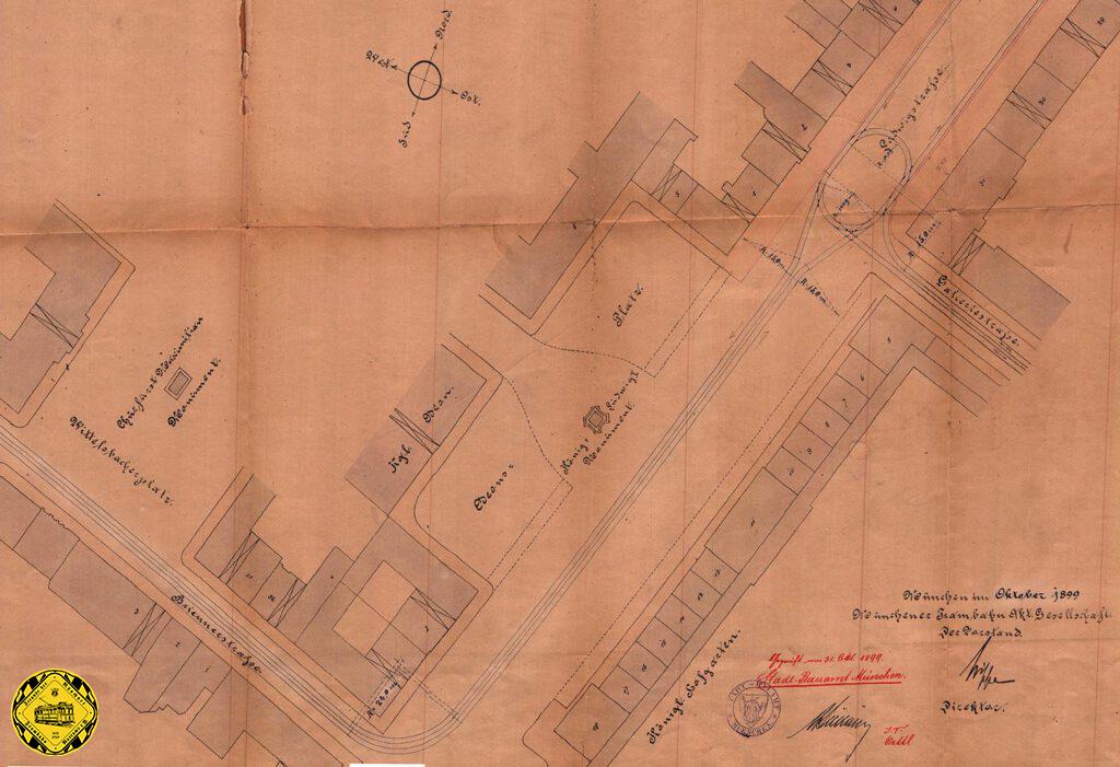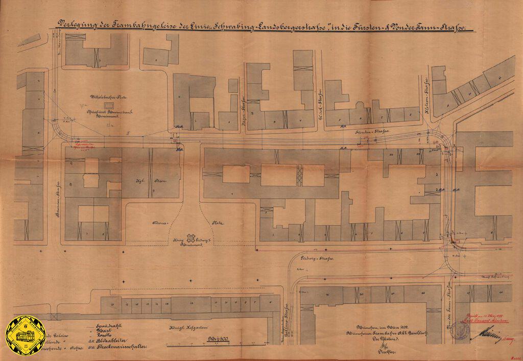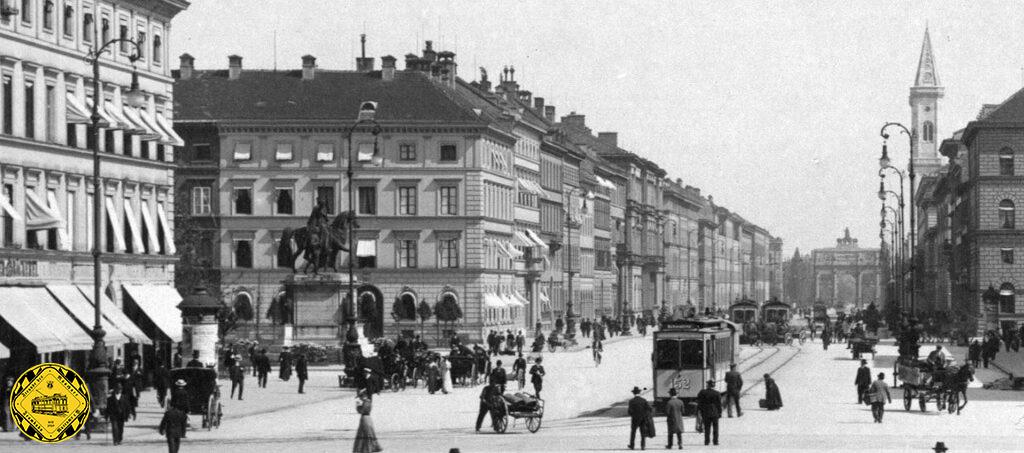 Der Ideenreichtum dieser Zeit war schier grenzenlos: wenn eine elektrische Oberleitungstrambahn am Odeonsplatz nicht gewünscht wird, dann fährt man eben drumherum. Da gerade sowieso über die Gleislage in der Ludwigstraße gesprochen wurde, – der Trend ging ab 1899 zur Seitenlage der Schienen wie schon in der Maximilianstraße im gleichen Jahr, könnte man im gleichen Zug auch den Odeonsplatz über die von-der-Tann-Straße und Fürstenstraße umfahren.