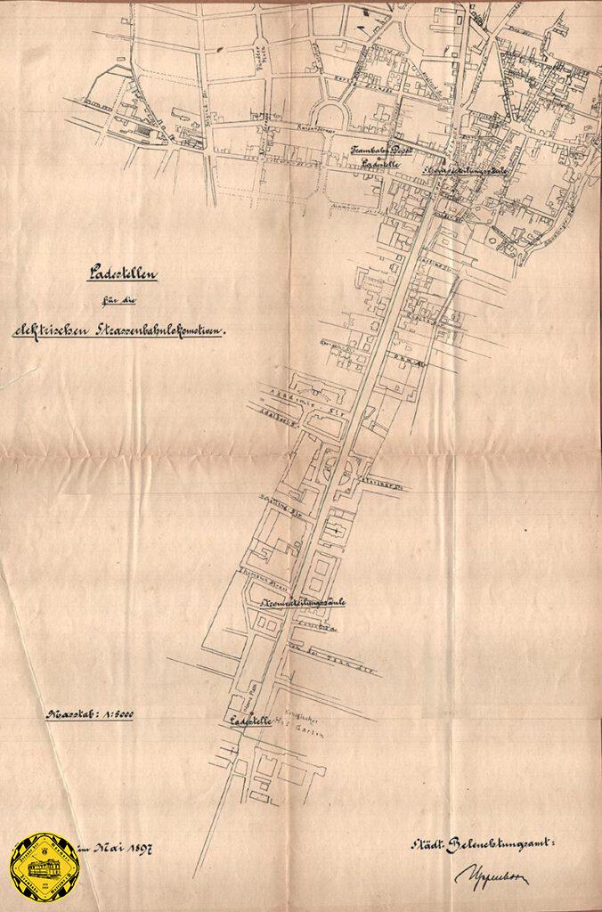 Die Idee mit der Akku-betriebenen Trambahn brachte Pläne auf den Tisch, überhaupt nur mit Akku-Betrieb zu arbeiten. Doch die Hybrid-Wagen waren nicht erfolgreich. So dachte man, – damals gab es ja noch bis 1900 den Dampftrambahnbetrieb, die Dampfloks nur durch Akku-Loks zu ersetzen. Ich finde in den Archiven immer wieder Vorstöße in diese Richtung. Das nebenstehende Dokument ist mit Mai 1897 datiert und zeigt eine Verteilung von Ladestationen für die Akkumulatoren-Lokomotiven entlang der Ludwigstraße. Damals interpretierte man ein erstes ablehnendes Schreiben aus der Residenz zum Oberleitungsbetrieb, dass es die komplette Ludwig- und Leopoldstraße betrifft.