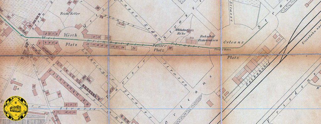 Der Stadtplan aus dem Jahr 1882 zeigt die beiden Pferdebahn-Linien, die nicht verbunden stumpf auf dem Orleansplatz enden.