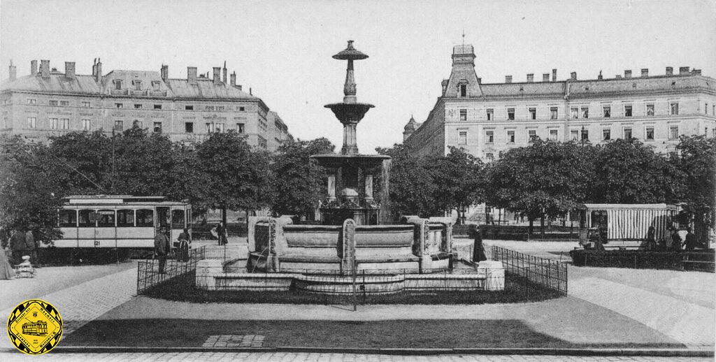 Der A1.1 Triebwagen 121 steht am Orleansplatz, vor ihm rechts ist noch ein Sommerwagen des Zuges vor ihm zu sehen. Der Glaspalast-Brunnen wanderte 1875 vom Glaspalast hierher zum Orleansplatz, – frühes Brunnen-Recycling quasi.