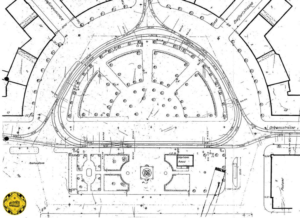 Die gleiche Karte mit dem Straßennetz-Overlay von heute zeigt den Ort des zu bauenden Ostbahnhofs.
