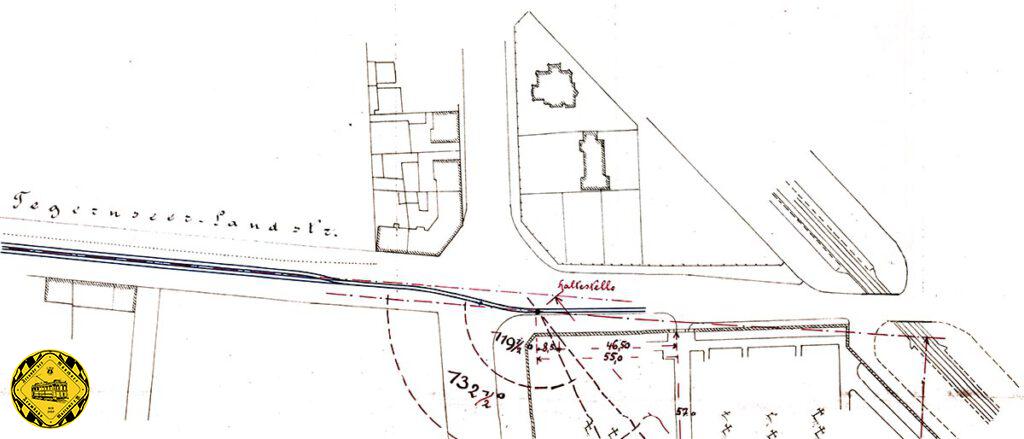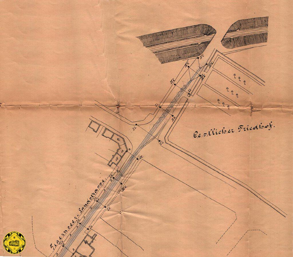 Der Gleisplan des Ostfriedhof in einem Plan des Beleuchtungsamts vom 24.Januar 1898, erstellt für Galvanometermessung am Ostfriedhof, um Störungen durch den Betrieb elektrischer Trambahnen zu messen.