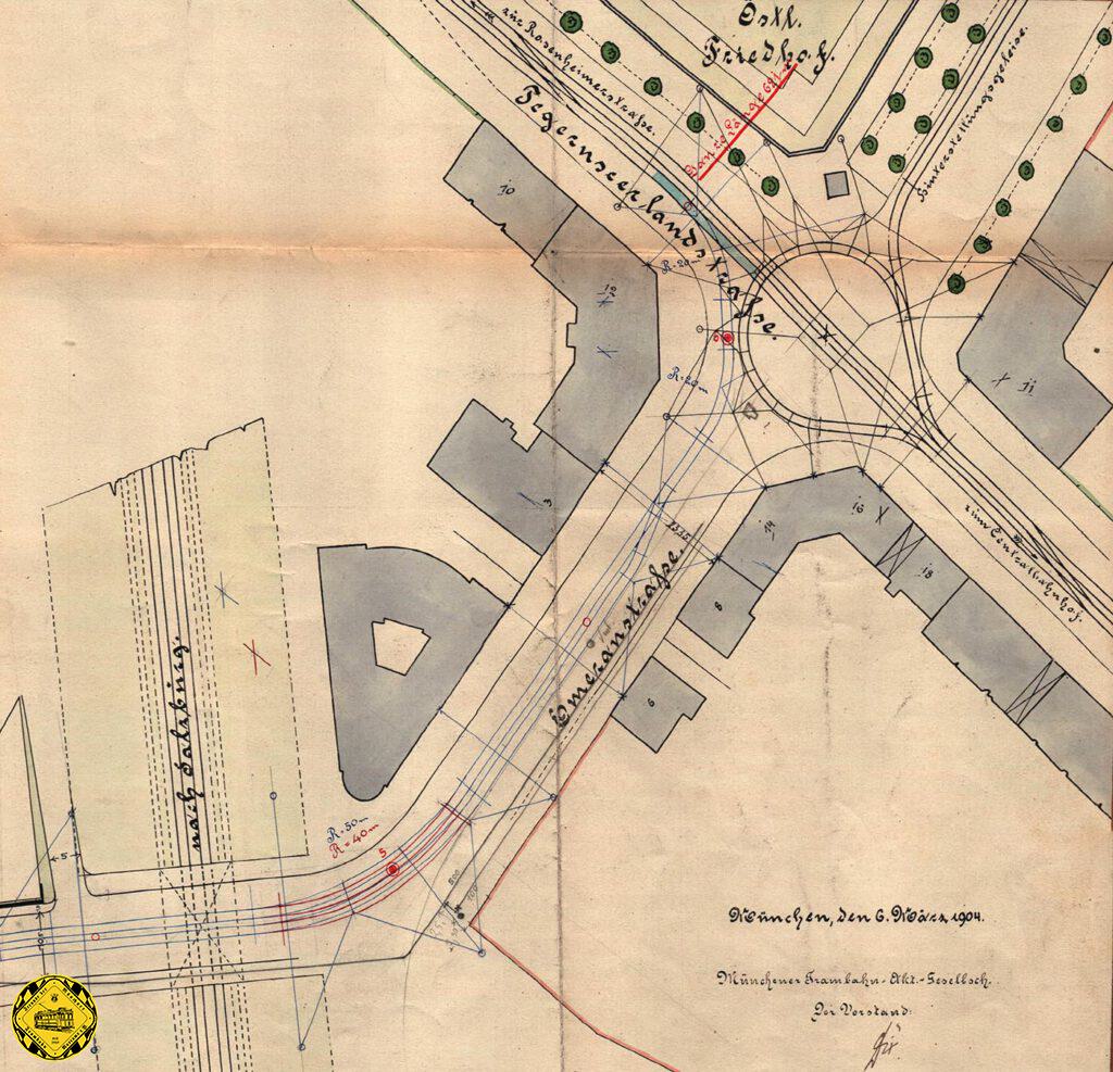 Auf unserem Plan von 1904 ist bereits die Ost-Tangente von der Rosenheimerstraße eingezeichnet und die geplante Strecke vom Nockherberg kommend.