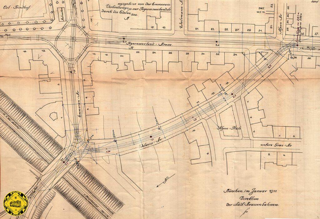 Am 16.April 1911 geht die Strecke durch die Edelweissstraße zwischen Tegernseer Landstraße und St. Bonifatiusstraße als Neubaustrecke zweigleisig mit einer Länge von 300m in Betrieb. Auf diesem Gleisplan ist auch die inzwischen durch die weiteren hinzugekommenen Strecken erweiterte Schleife am Ostfriedhof zu sehen.