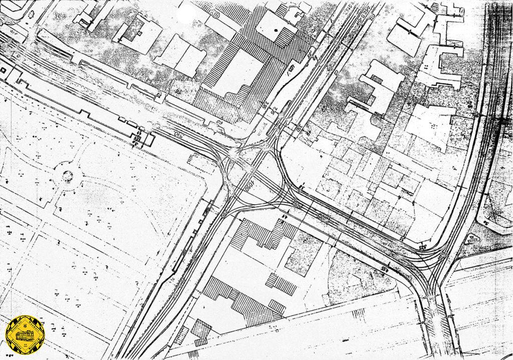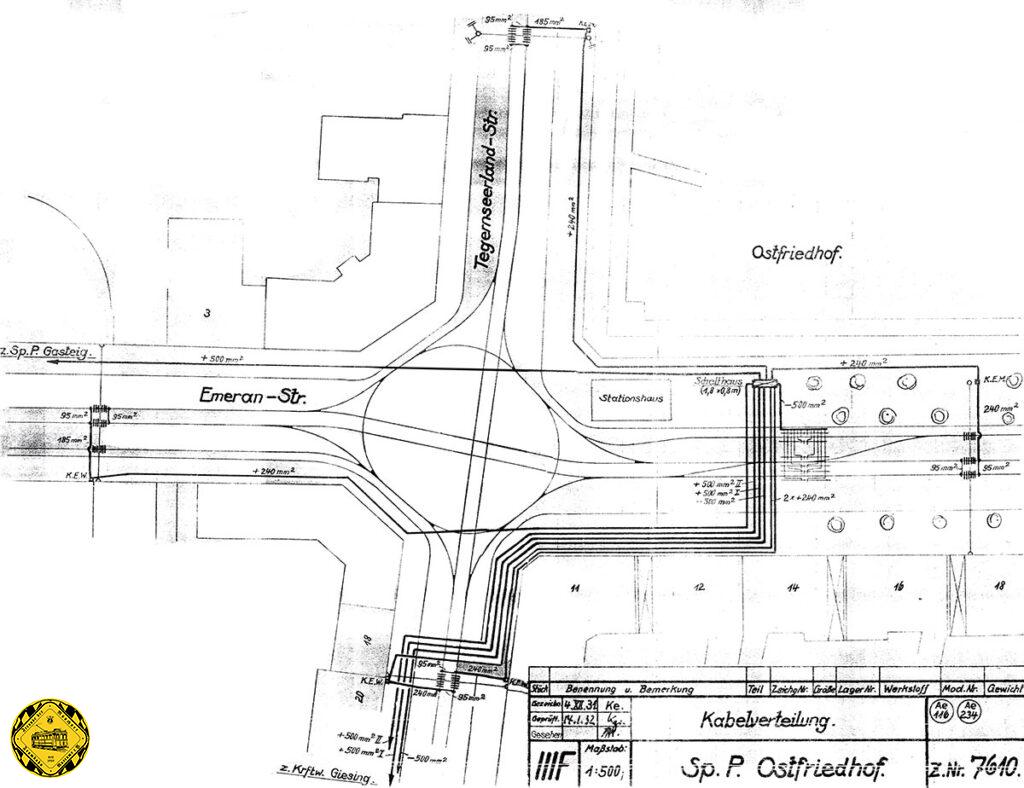 Dieser Plan ist auf den 4.Dezember 1931 datiert und zeigt neben der Stromversorgung in dieser Zeit auch gut die Gleislagen am Ostfriedhof: ein in München gerne gebaute Version mit Kreis in der Mitte und Wendemöglichkeiten nun in alle Richtungen, auch von Ost nach Nord, wie auch z.B. zu dieser Zeit ähnlich am Baldeplatz und Max II Denkmal.