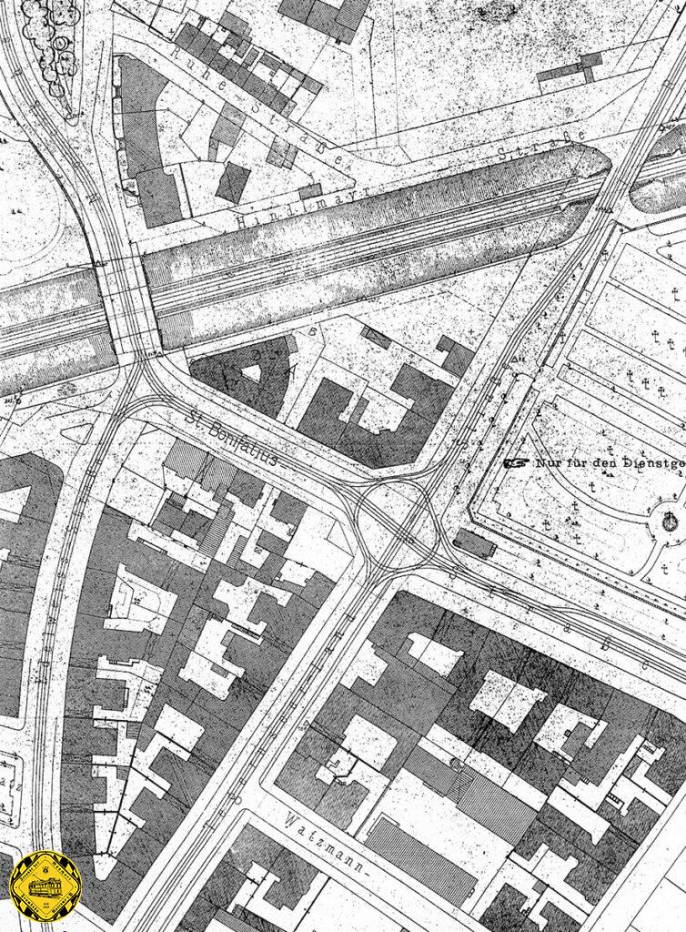 Dieser Plan zeigt Maximalausbau des Knoten Ostfriedhof mit Ausweich- und Hinterstellgleisen sowohl westlich als auch östlich vom Ostfriedhof in der Bonifaziusstraße und die hinzugekommene direkte Abzweigemöglichkeit von der Bonifaziusstraße einwärts nördlich in die Osttangente. Am 25.7.1926 werden die Hinterstellgleise in der St. Bonifatiusstraße nochmals umgebaut mit der Verlängerung des bestehenden Hinterstellgleises nach einer Bauzeit vom 17.Juli – 25. Juli 1926. Außerdem wird an der St. Bonifatiusstraße / Edelweißstraße das Gleisdreick bei der Gleiserneuerung den bestehenden Betriebsverhältnissen angepasst.