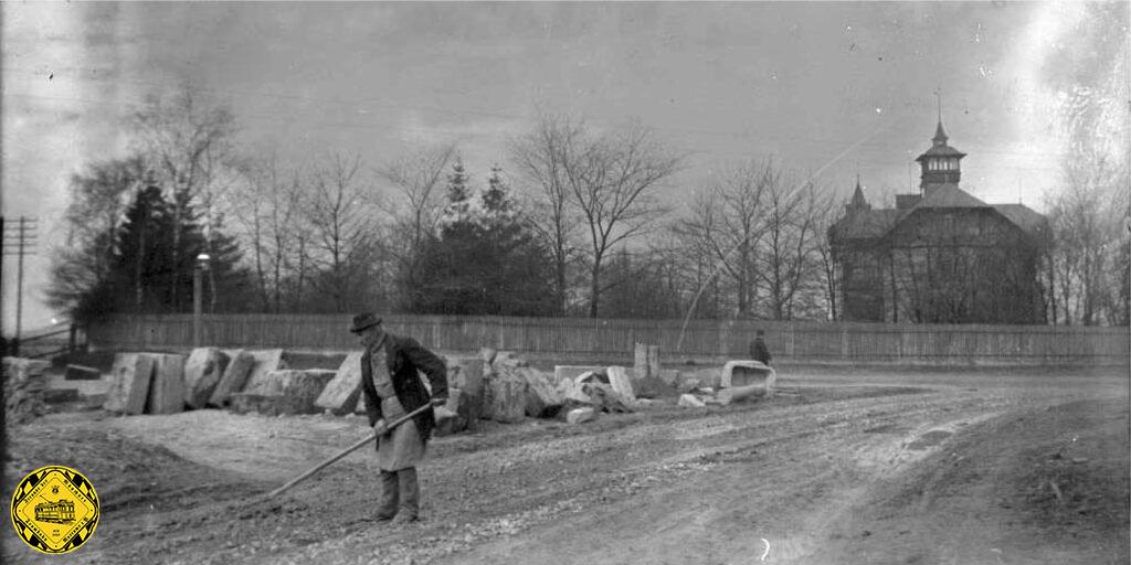 Eine weitere Strecke aus der Stadt wird nun den Ostfriedhof endgültig zu einem Kreuzungspunkt der Münchner Trambahn machen: die Linie über den Nockherberg weiter zum Bahnhof Giesing. Dazu muß aber erst der Nockherberg reguliert werden, da er einen zu starke Steigung aufweist für die elektrische Trambahn. Im Hintergrund die Villa von Schmederer, 1882 erbaut nach Planung Albert Schmidt, im 2. Weltkrieg durch Bomben zerstört, Areal und Ruine im Jahr 1952 abgetragen. H. Schmerderer wurde mit seiner Eisfabrik in München reich.