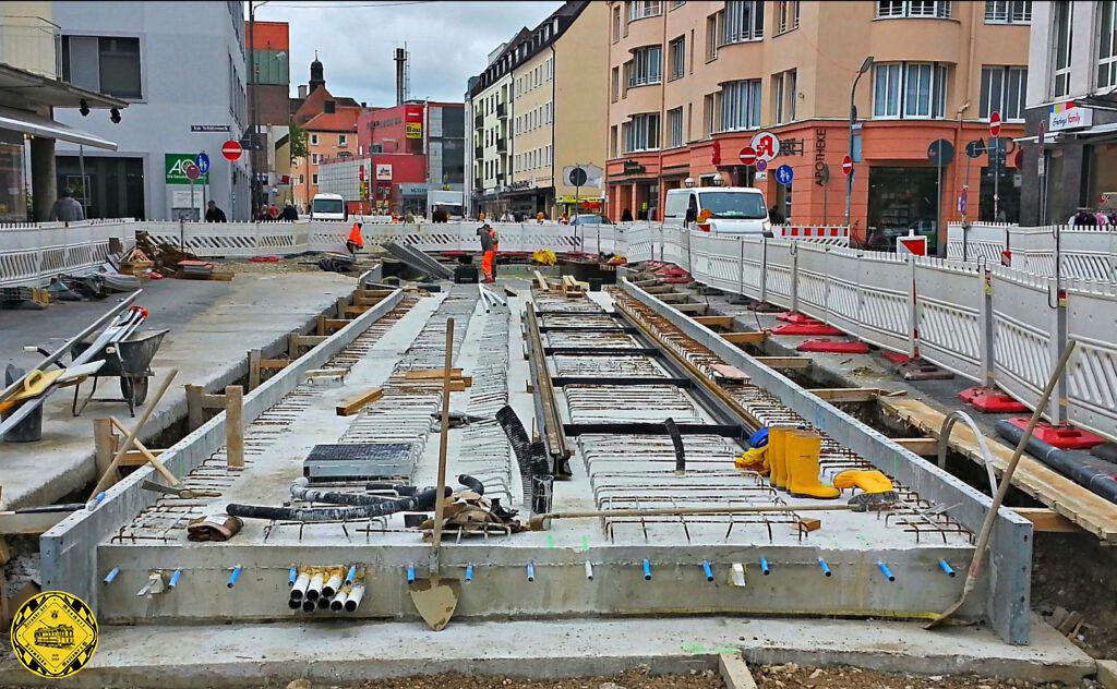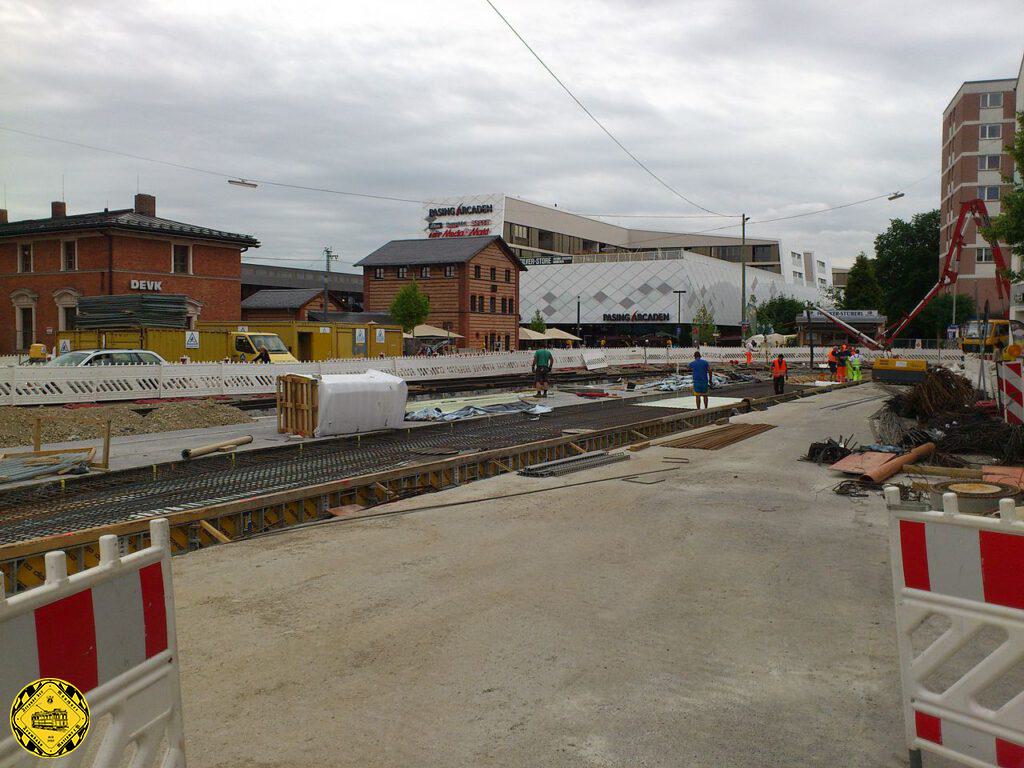Der Blick aus dem All im Sommer 2012 auf Pasing: die Wendeschleife ist noch in Betrieb und in der Gleichmannstraße und Bahnhofstraße werden schon die Fundamente für die neue Trambahnstrecke gegossen.